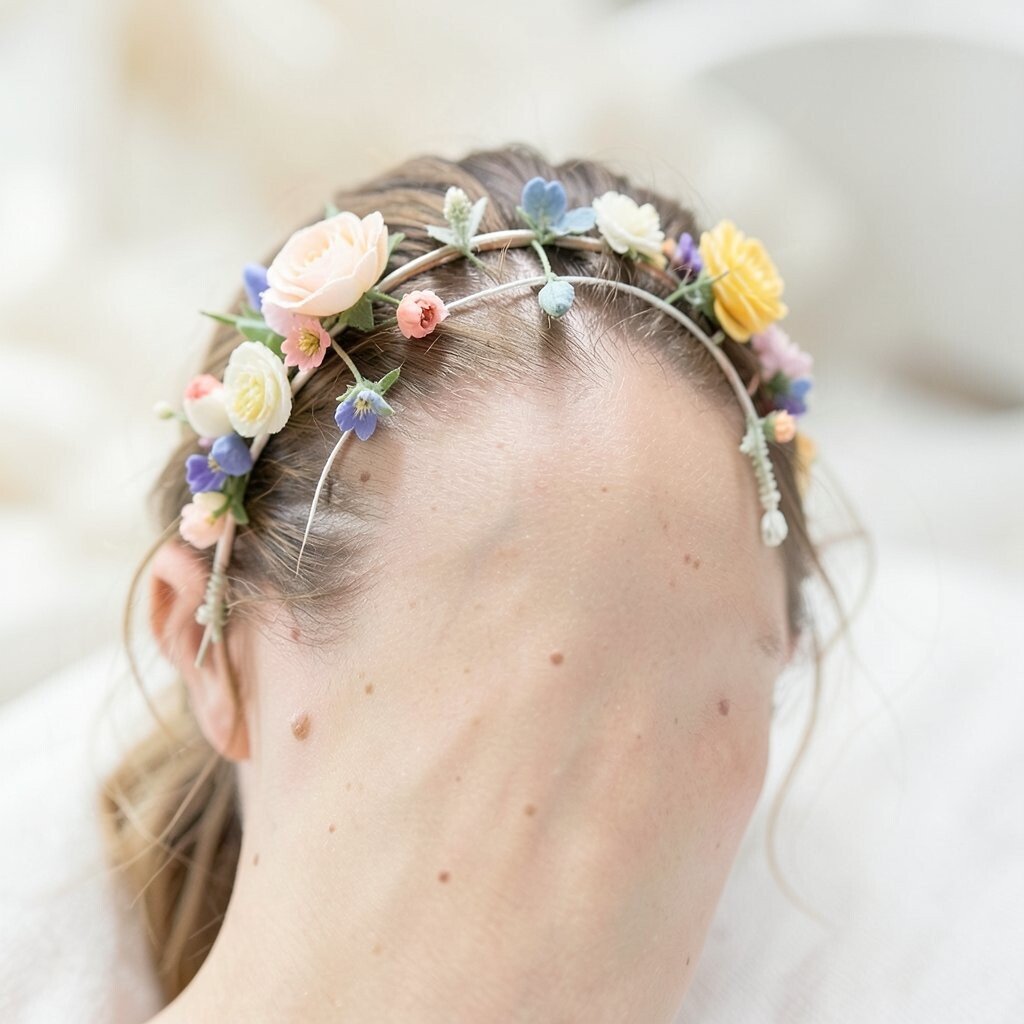 Floral wire headbands can look light and airy, almost like a crown. Small flowers or leaves give them a fresh garden feel.