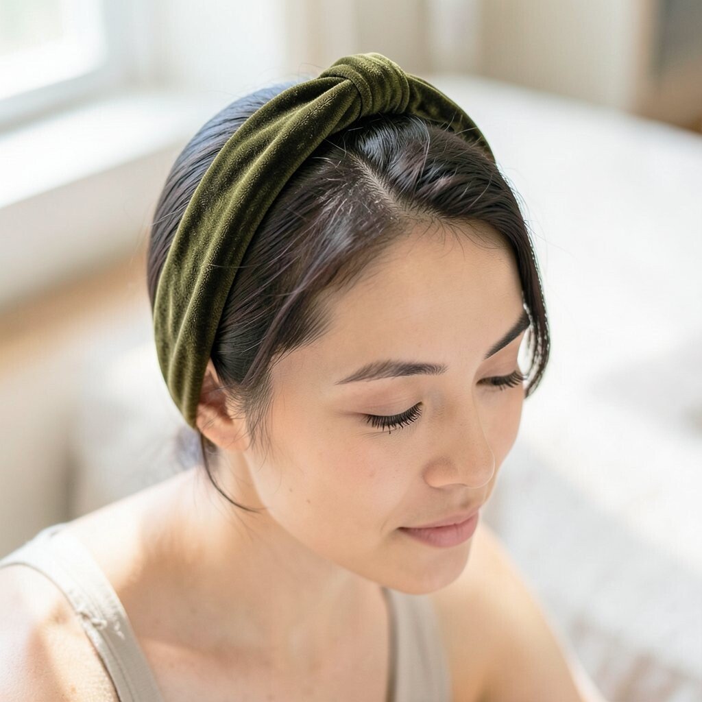 Wrap a velvet strip around a thin band and secure the back. Add a twist or a small knot in front for extra charm.
