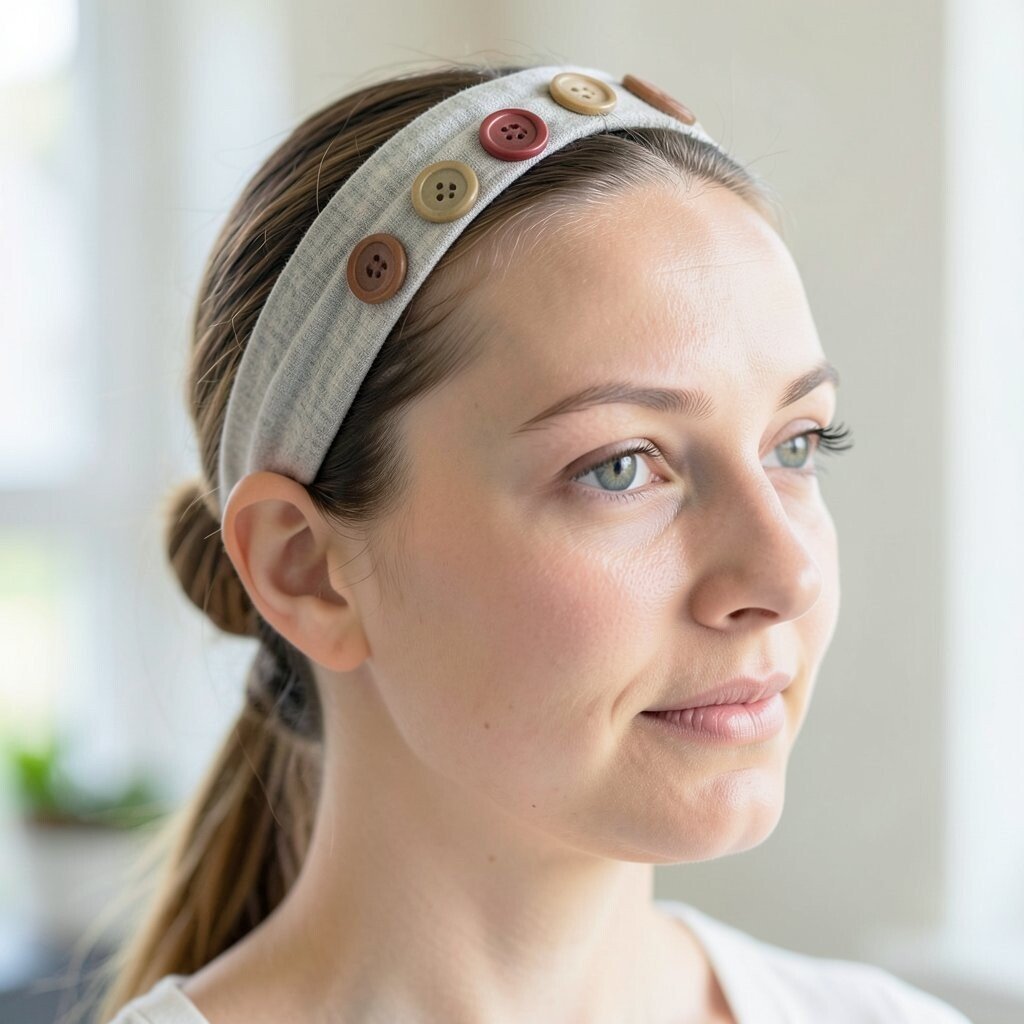 Buttons can make a plain headband look bright, fun, and full of charm. The mix of shapes and colors gives it a playful handmade style.