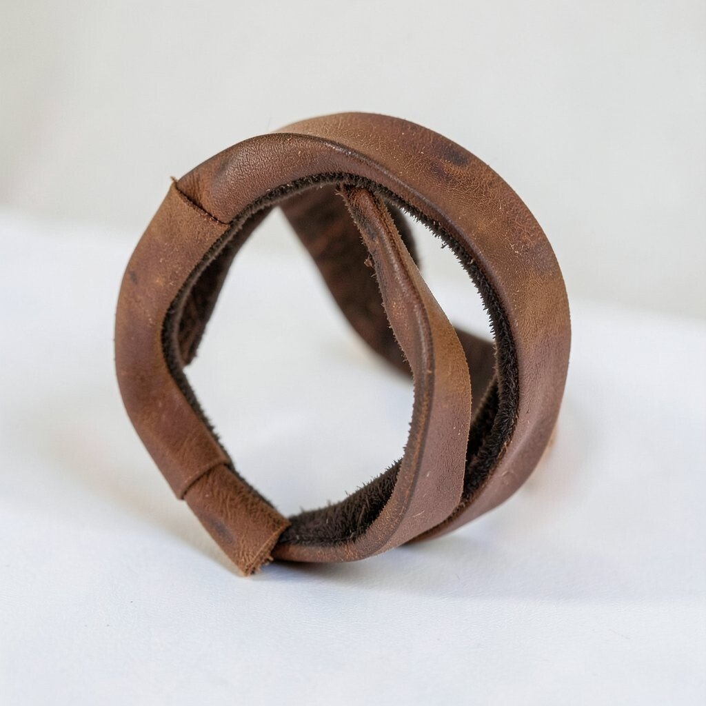 Use faux leather scraps, an old belt, or craft leather pieces. Cut a strip, shape it, and add a small knot or fold in the front.