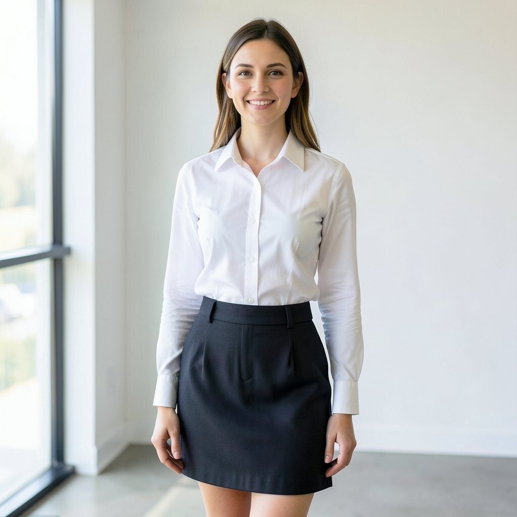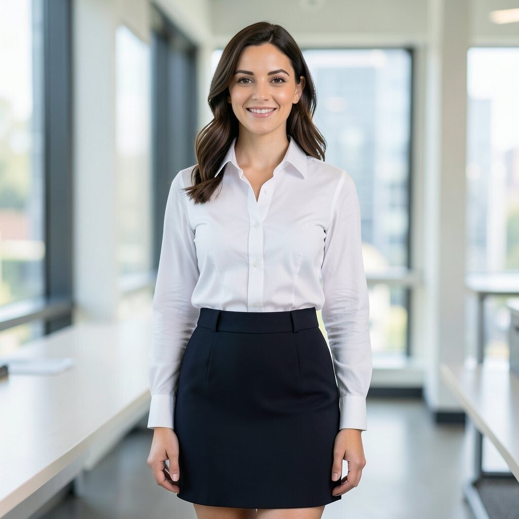 High-waisted skirts create a flattering silhouette. Tuck your white shirt into the skirt for a polished look. This combination is both professional and feminine.