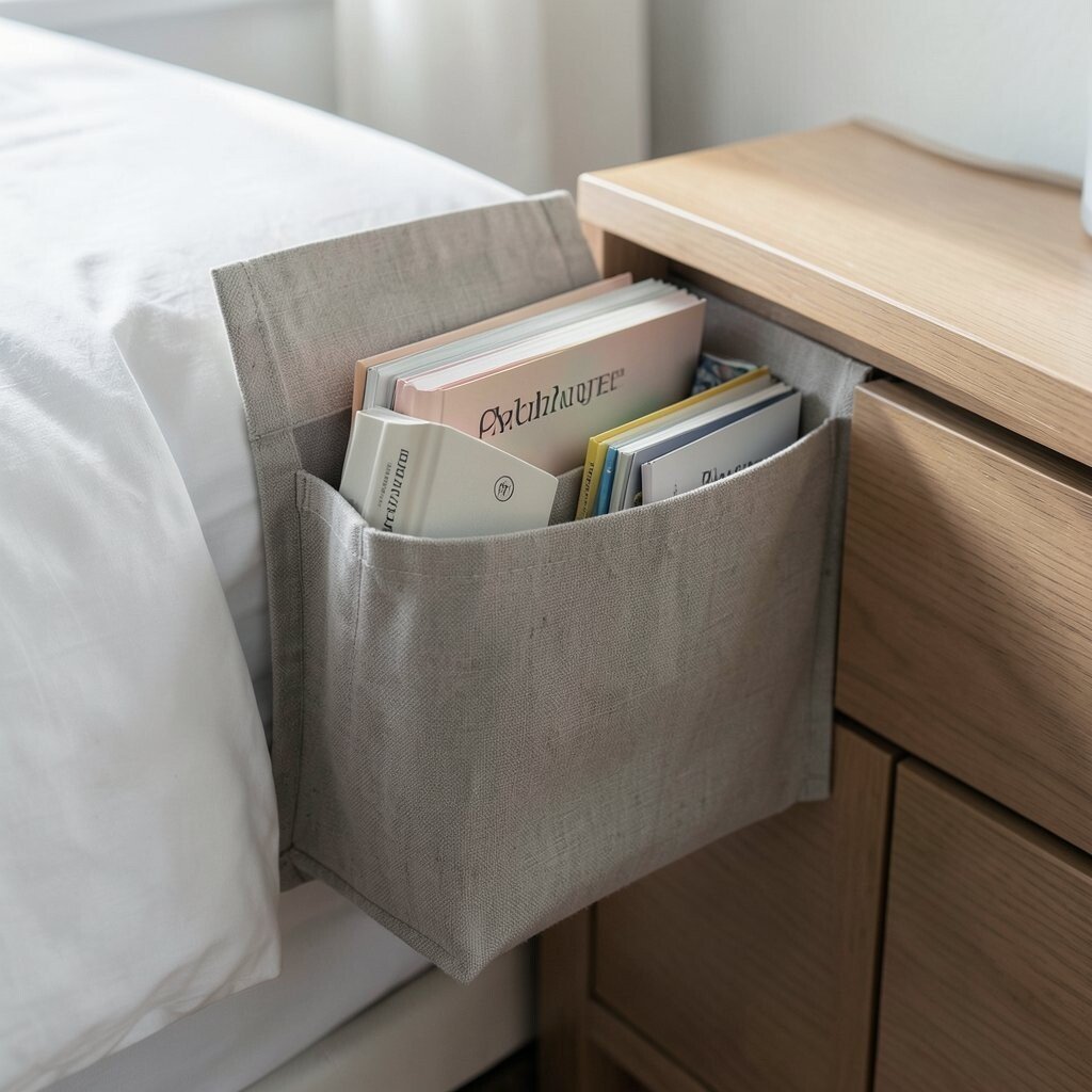 Perfect for keeping your nighttime essentials handy. Store books, glasses, and your phone right beside your bed. The soft fabric adds a cozy touch.