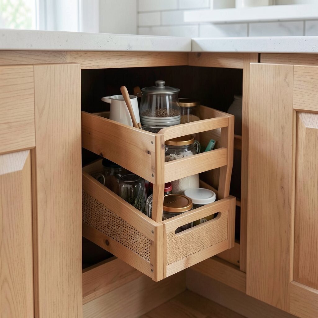 Use a pocket organizer inside a cabinet door for storing lids, kitchen towels, or utensils. It makes use of often-overlooked space.