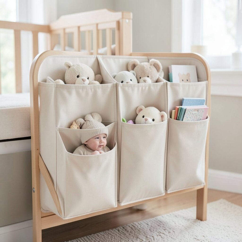 Perfect for storing baby essentials like diapers, wipes, and toys. Hang it on the crib or changing table for convenience. The soft pockets are gentle on baby items.