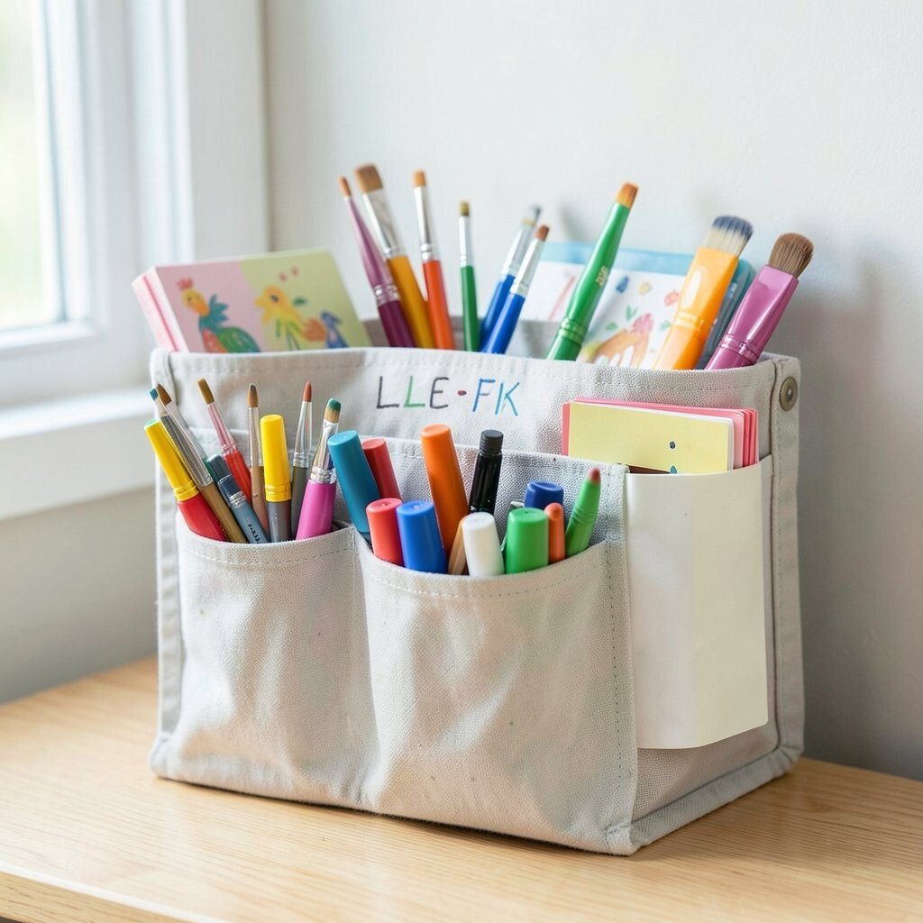 Organize your kids’ art supplies with a pocket organizer. Store crayons, markers, and paper in the pockets. It keeps everything tidy and ready for creative fun.