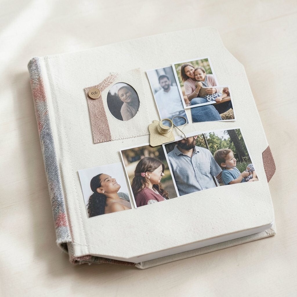 Why not start with a touch of nostalgia? Include personal photos alongside your fabric samples. It adds a personal touch and makes your book feel more like a scrapbook.
