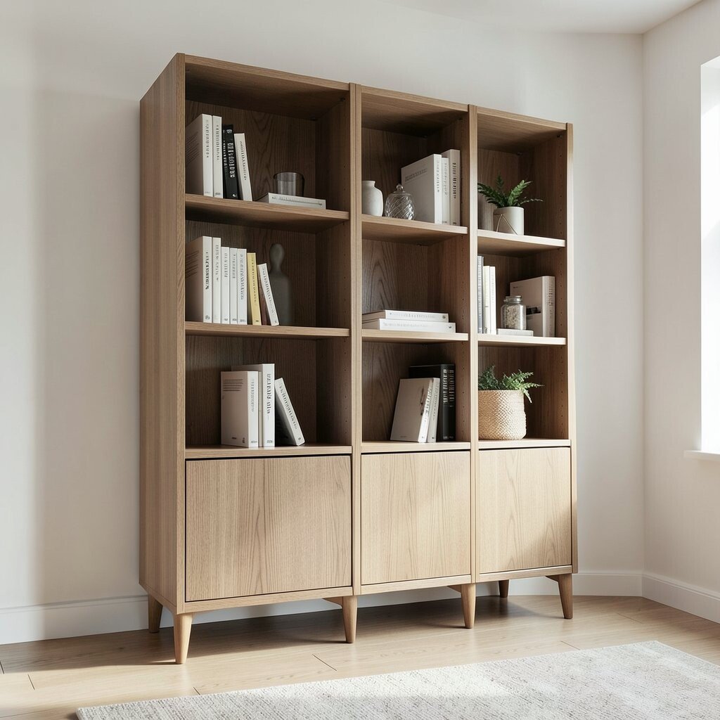 Look for one with a minimalist design to match the Japandi theme. These bookcases can be expanded or reconfigured as your needs change.