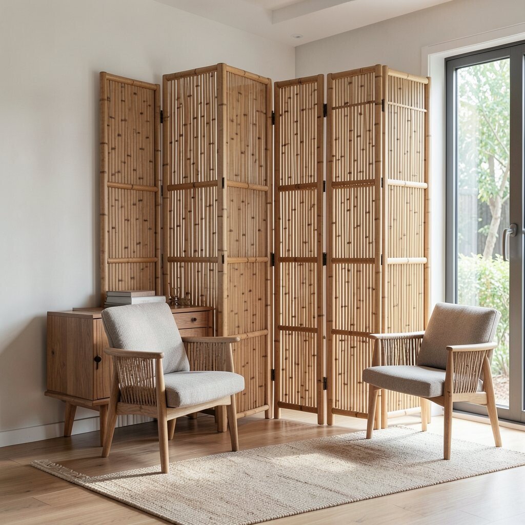 A bamboo room divider offers both function and style. It’s perfect for sectioning off areas without closing them in completely.