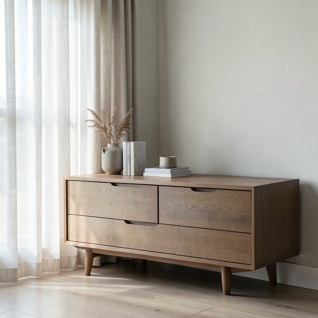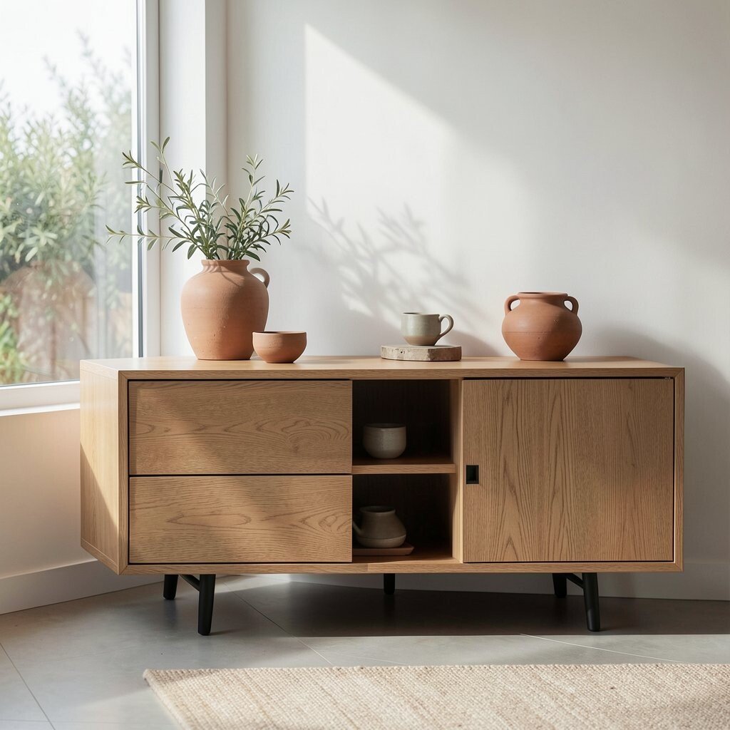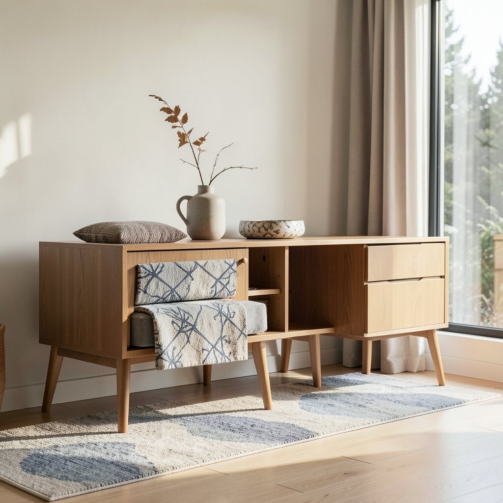Choose a light wood finish to keep the space feeling open and airy. You can personalize it with a small plant or a decorative lamp.