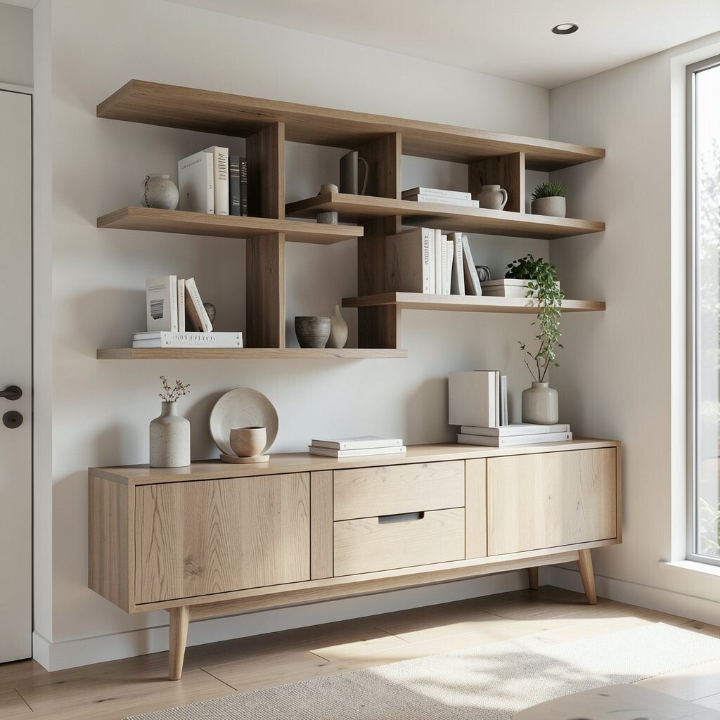 Choose natural wood or white finishes for a cohesive look. These shelves are perfect for showcasing books, plants, or art pieces.