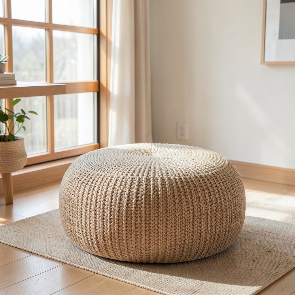 A natural fiber pouf adds texture and comfort to your living space. It’s a versatile piece that can serve as a footrest or extra seating.