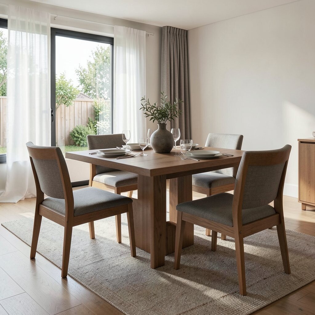 Pair it with comfortable chairs in a complementary wood tone. You can dress it up with a minimalist table runner or a simple floral arrangement.