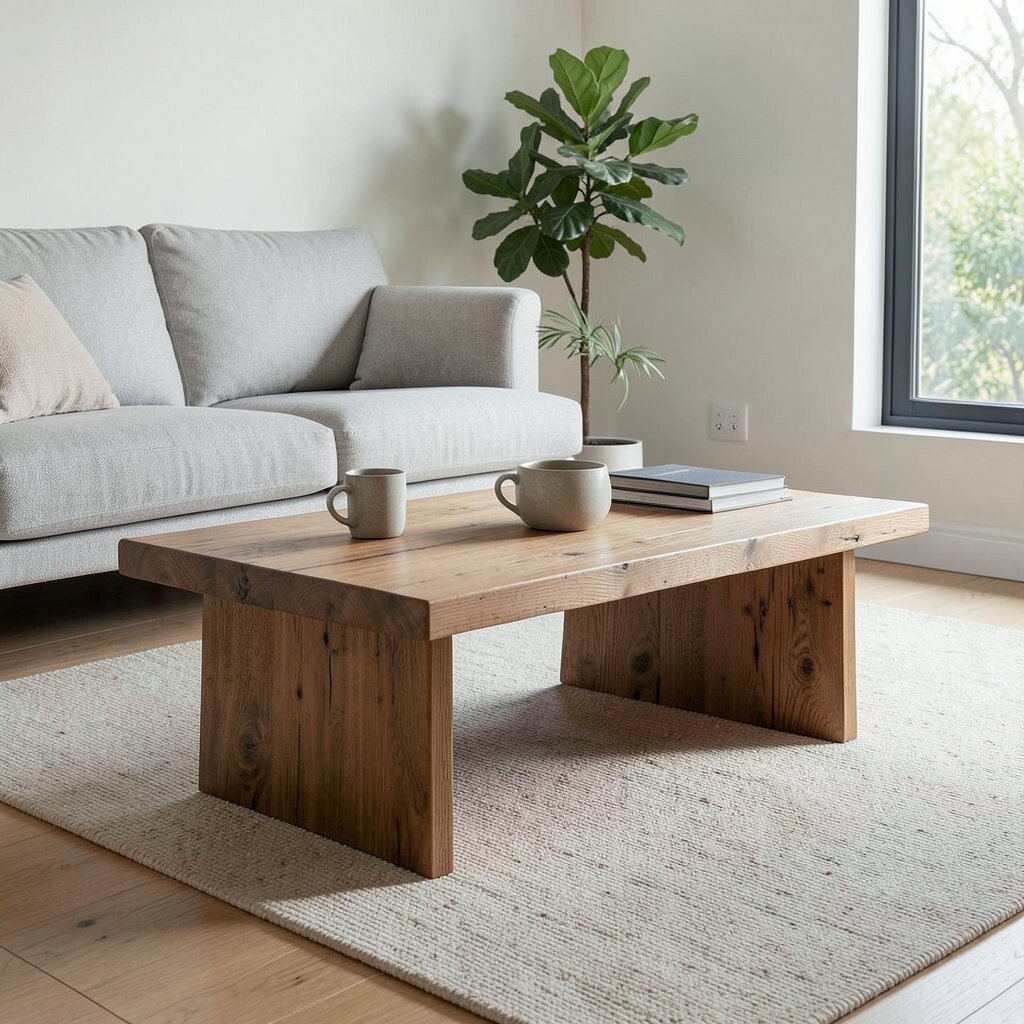 A wooden coffee table with a simple, sturdy design adds warmth and functionality. Opt for a natural wood finish that highlights the grain.