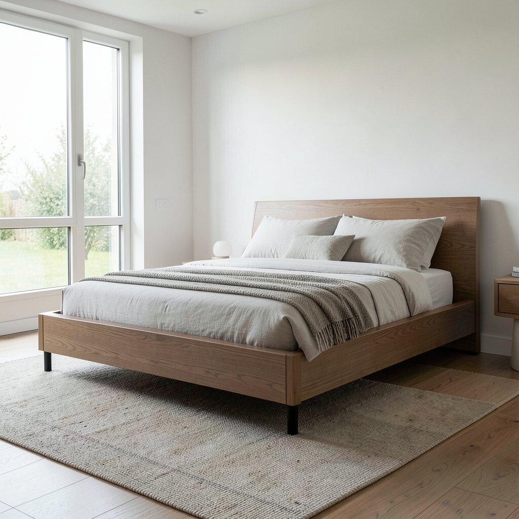 A low-profile bed frame aligns with Japandi’s minimalist aesthetic. Choose one in a natural wood finish for a warm, inviting look.