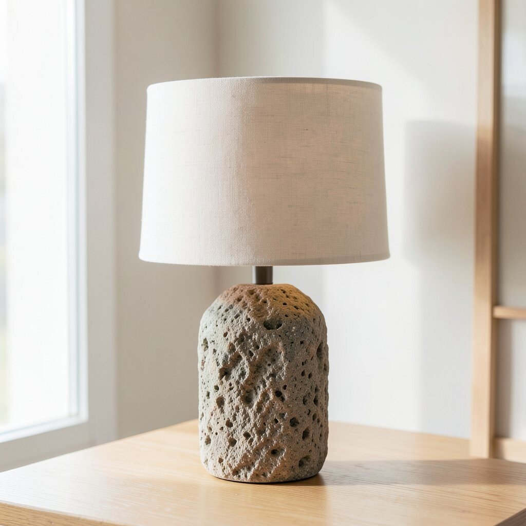 A stone base lamp brings a sense of nature indoors. Its solid foundation contrasts beautifully with soft, diffused light.