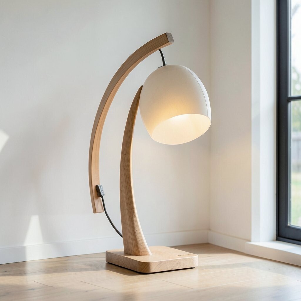 A wooden arc floor lamp stands tall and graceful in any room. Its curved design adds a soft touch to sharp angles.