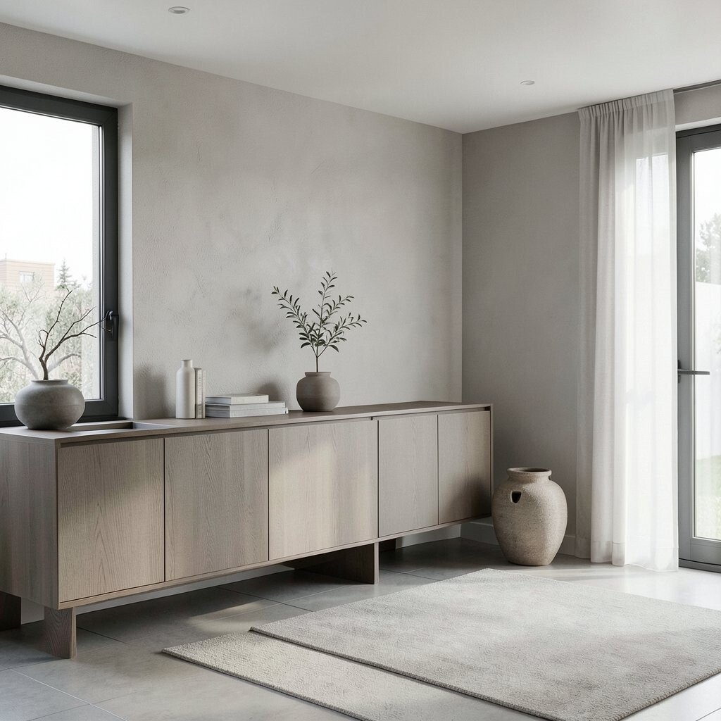 Keep only essential items visible on tables and countertops. This simplicity is a key component of Japandi style.