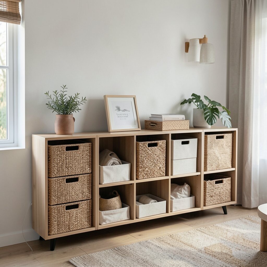 Use baskets or boxes to keep smaller items tidy. Clear surfaces and neat spaces contribute to a calm atmosphere.