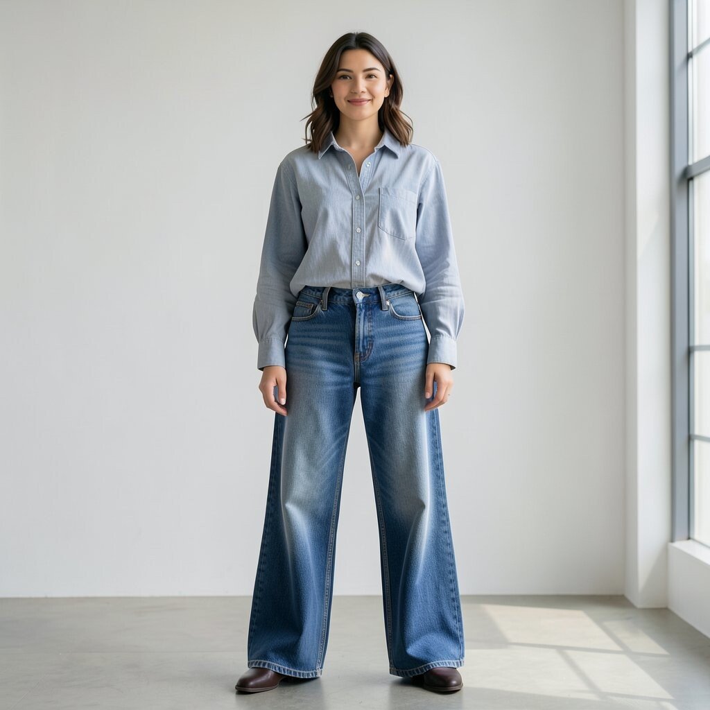 A button-down shirt tucked into wide-leg jeans gives a clean, relaxed shape with a touch of polish. The wide legs add movement and make the outfit feel fresh and current.