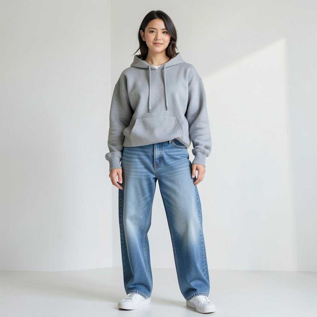 A hoodie with relaxed jeans gives a soft, easy look that feels friendly and modern. The loose fit makes the outfit comfortable while still looking planned.