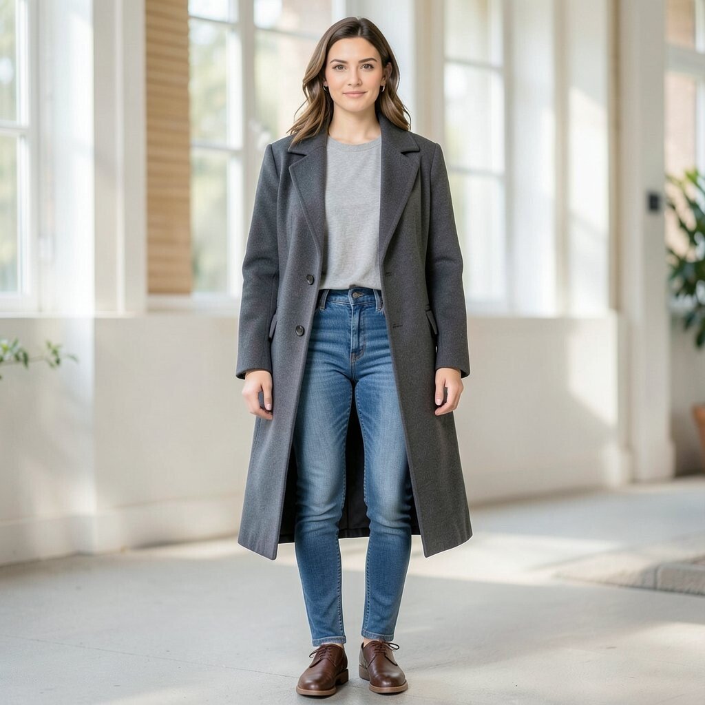 A long coat over slim jeans creates a tall, sleek shape that looks polished right away. The coat adds drama, while the jeans keep the outfit simple and useful.