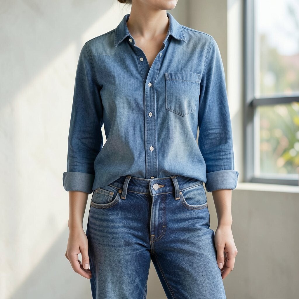 This outfit works well for people who like classic pieces with a little personality. It can be styled with sleeves rolled up, a half tuck, or layered jewelry for a more personal feel. If you want to save money, vintage jeans and chambray shirts are often easy to find secondhand.