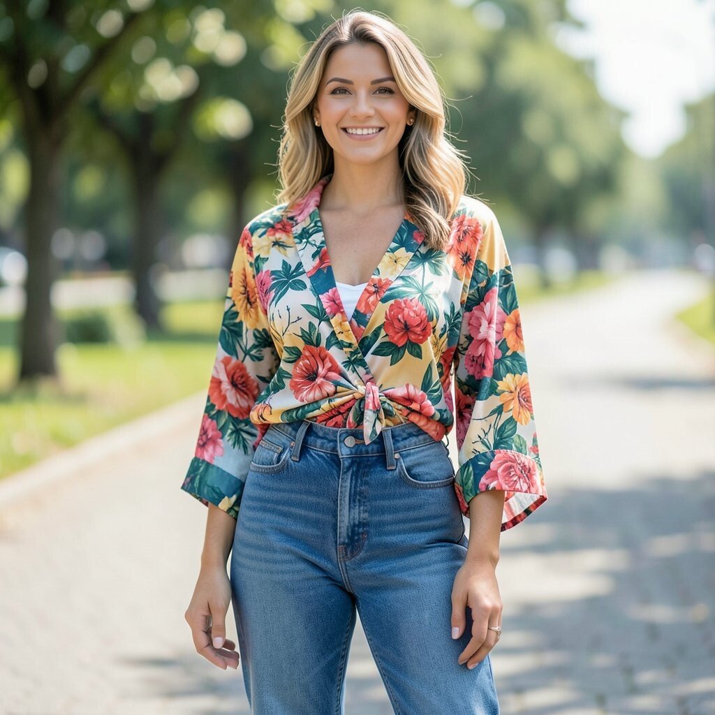 Flat sandals, a simple tank, and a crossbody bag can keep the outfit balanced. If you are watching your budget, a fun kimono can refresh many old jeans outfits at once. It is also a good way to show your style without wearing something tight.