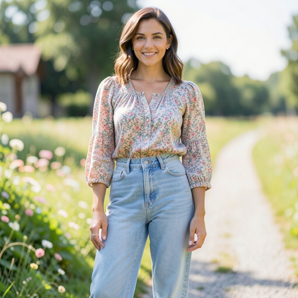 Try espadrilles, sandals, or even simple flats to finish the look. If you want to save money, one pretty blouse can make many jeans outfits feel new. This style also works well with a straw hat or woven purse.