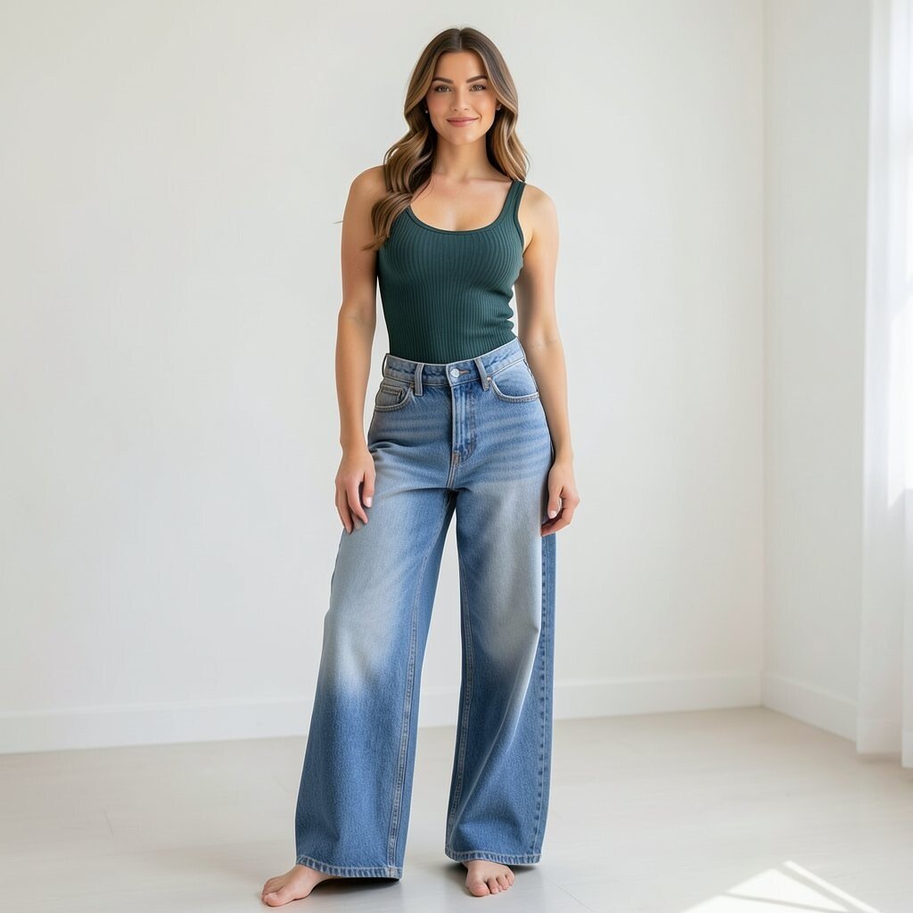 Wide-leg jeans bring a soft, flowing shape that looks stylish right away. A fitted bodysuit balances the volume and keeps the outfit neat.