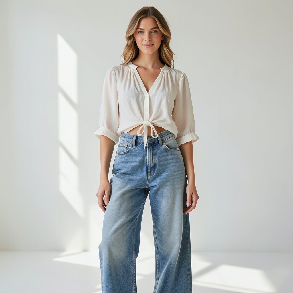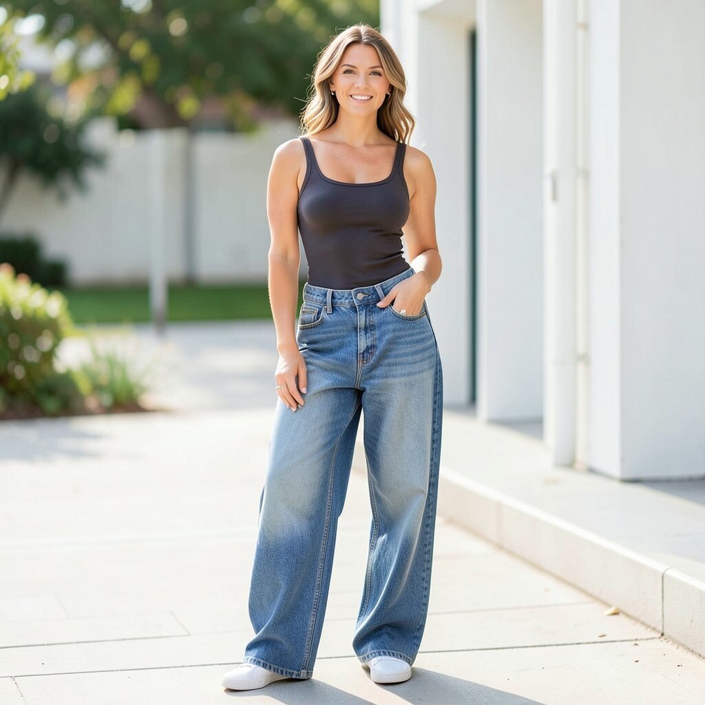 For a low-cost look, choose one bold top and keep the jeans classic. Small hoops or a slim belt can add style without much extra spend. This mix feels current because easy shapes are popular right now.