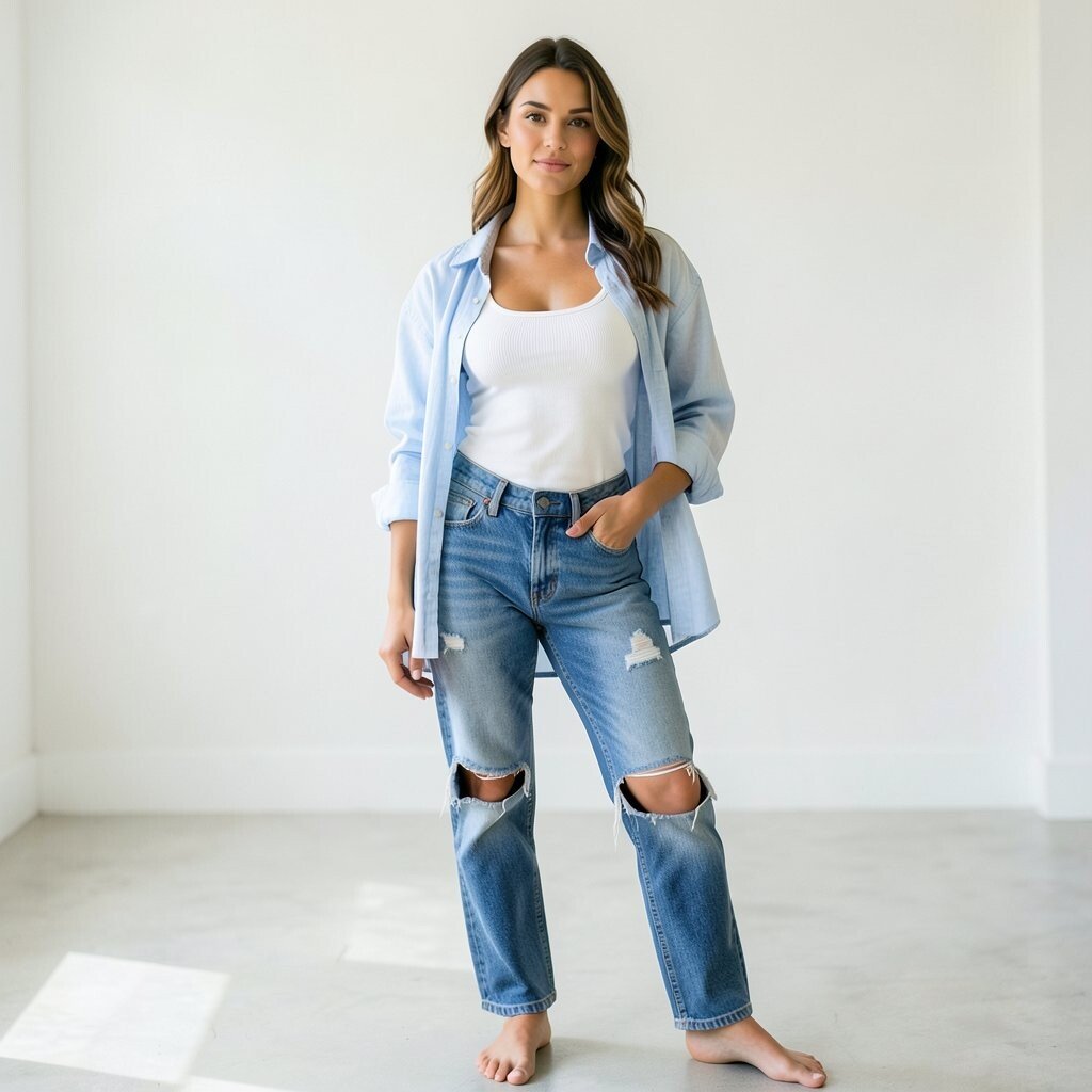 Distressed jeans bring a cool, worn-in look that feels casual. A sleeveless blazer adds a sharp shape and makes the outfit feel more grown-up.
