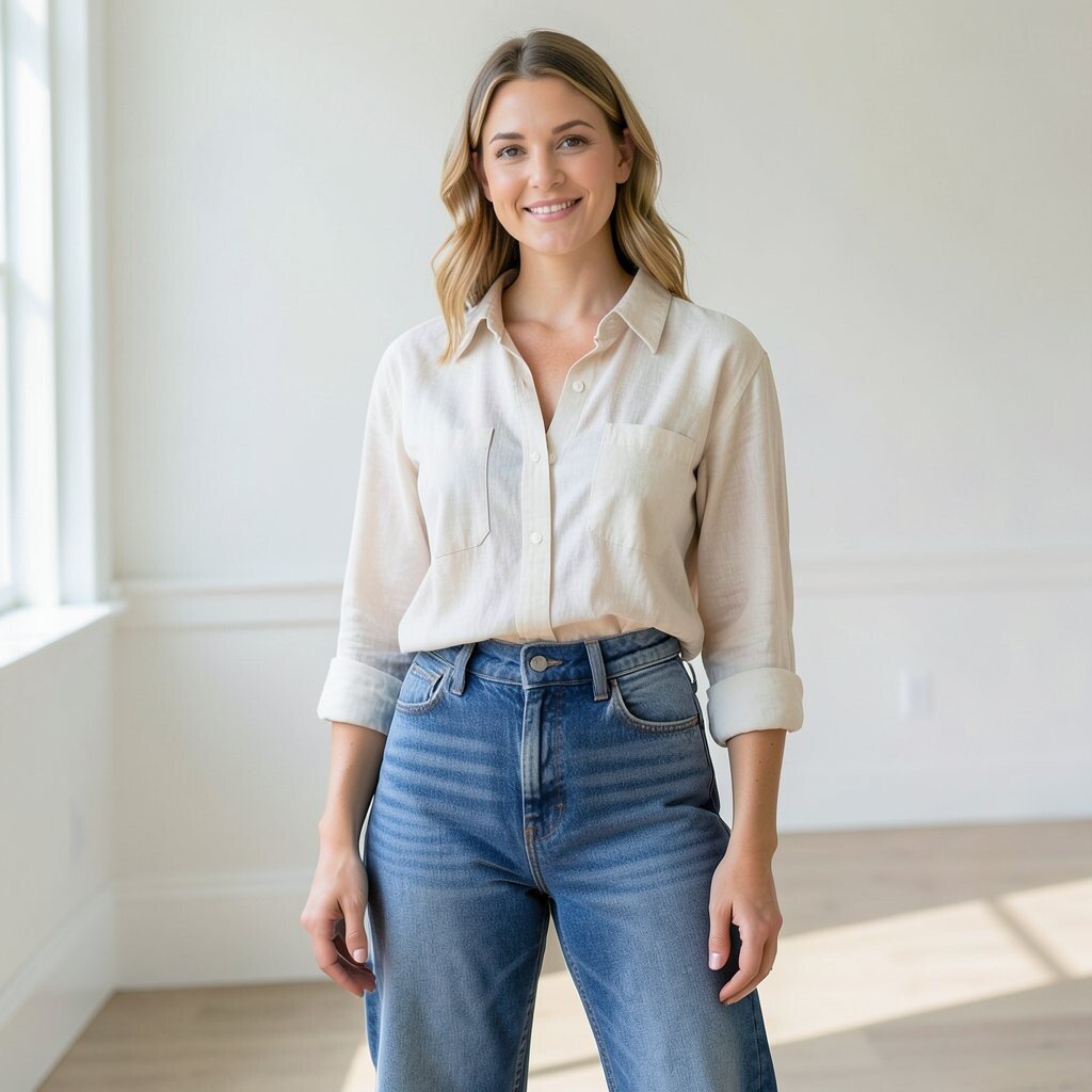 Straight-leg jeans make a neat line that looks modern and relaxed. A cropped shirt adds a fresh touch without feeling too dressed up.