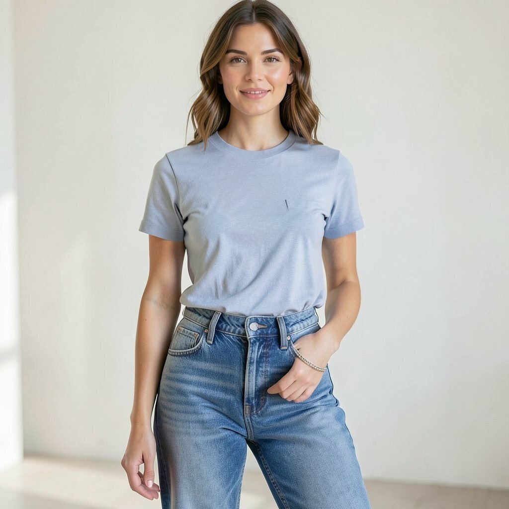 Slim jeans give a clean base that feels neat and easy. A boxy tee adds a modern shape and a cool, relaxed mood.