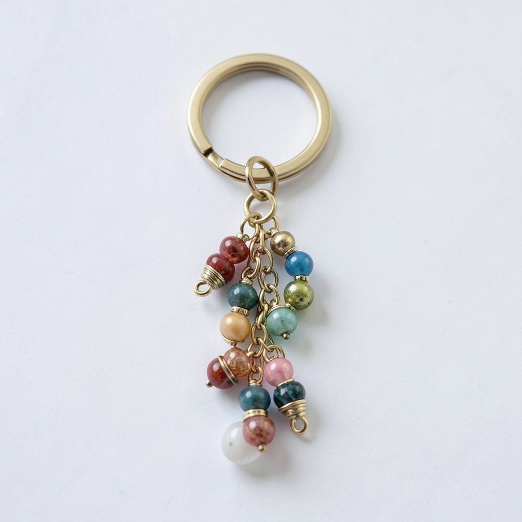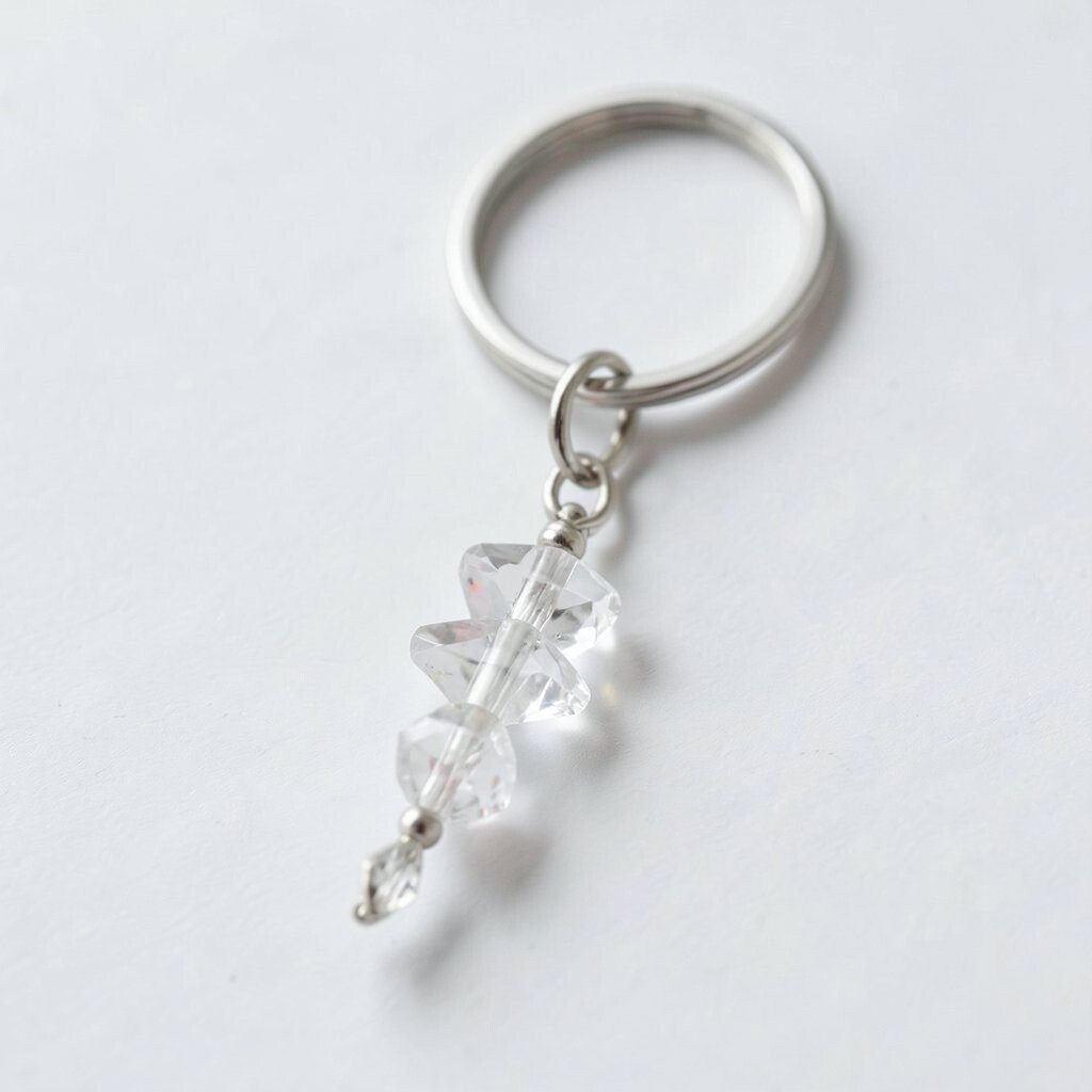 Crystal bead keychains sparkle in the light and can look bright and fancy. The beads may be clear, colored, or faceted, which gives them a rich shine.
