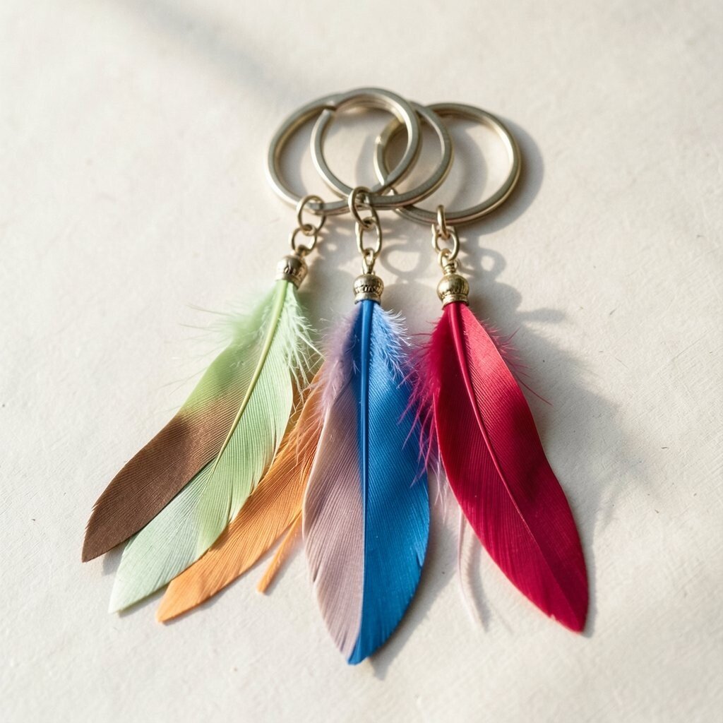 Boho style keychains with vinyl feathers feel soft, artsy, and relaxed. The feather shape looks lovely in earthy colors like tan, rust, sage, and cream.