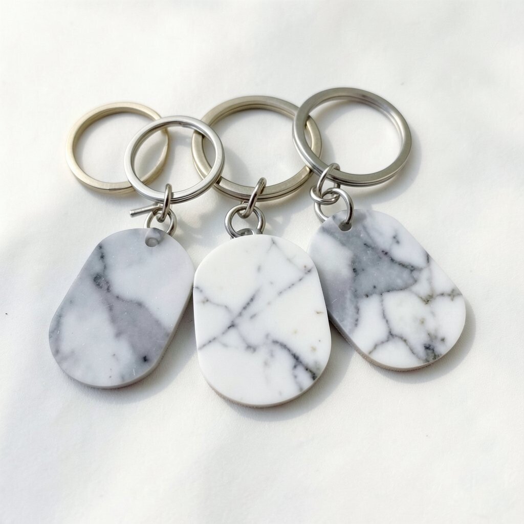 Marble look keychains feel smooth, stylish, and a little fancy. Vinyl accents can add a name, shape, or border that stands out against the stone-like background.