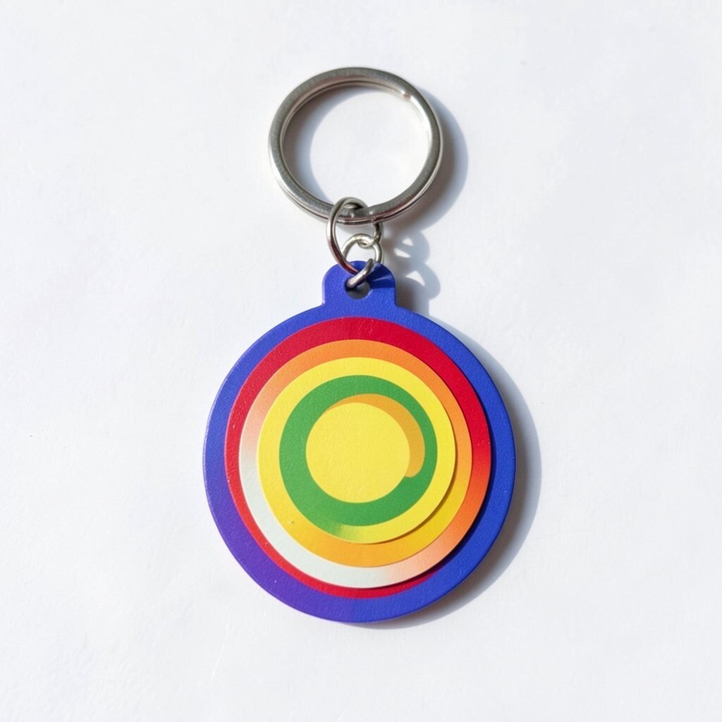 Layered vinyl in rainbow colors creates a bright and happy look. The stacked colors give the keychain depth and make it feel more playful.