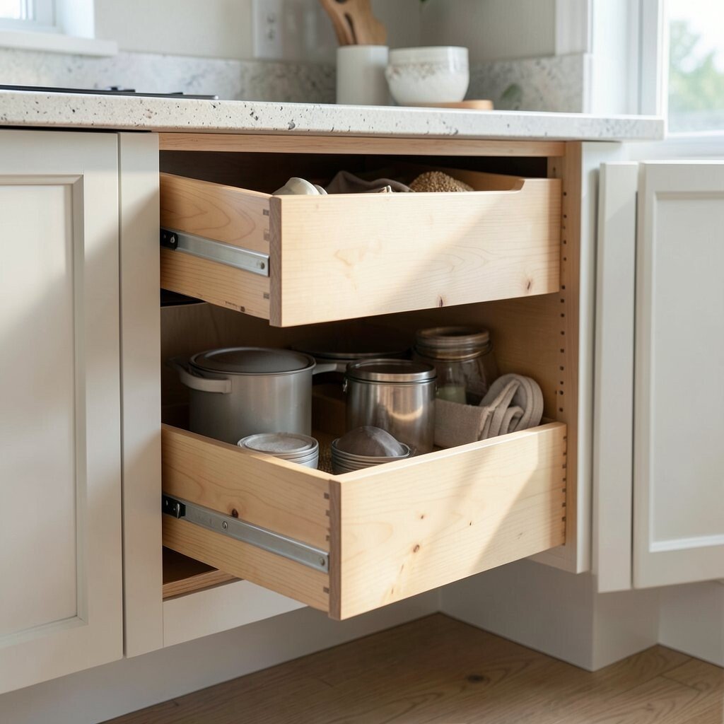 Roll-out cabinet drawers transform deep cabinets into accessible spaces. They eliminate the need to bend or reach awkwardly.