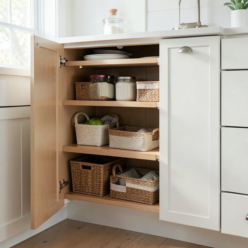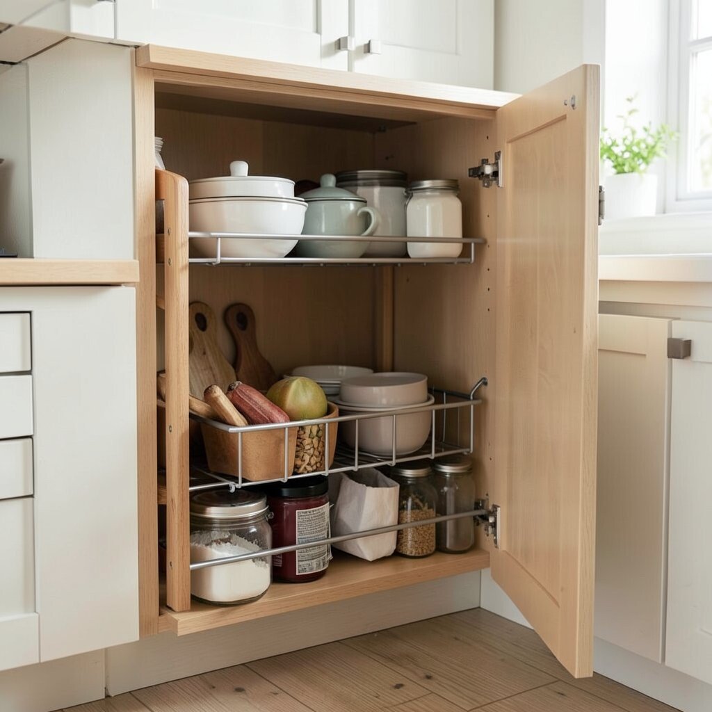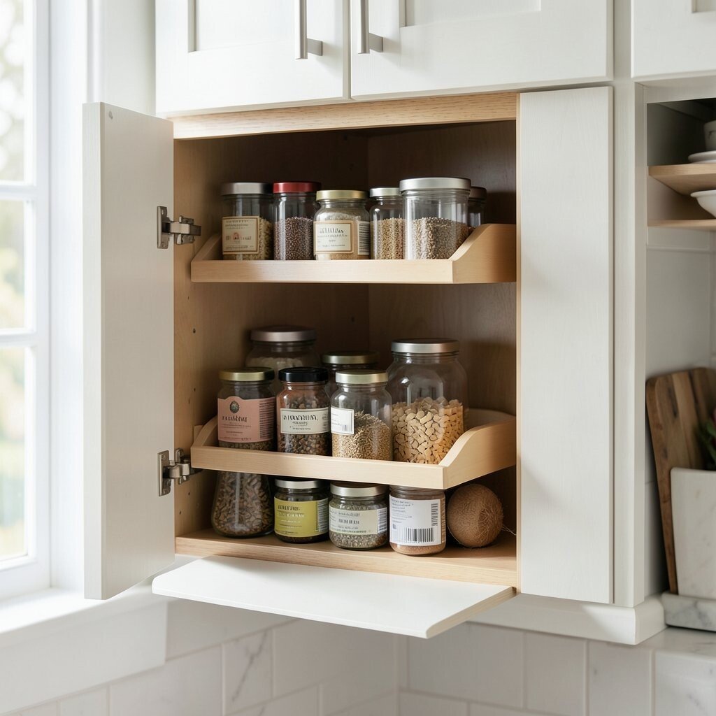 These shelves glide out effortlessly, offering easy access to all your items. You can store various products, from canned goods to spices, without hassle. This solution not only saves space but also helps prevent items from getting lost in the back.