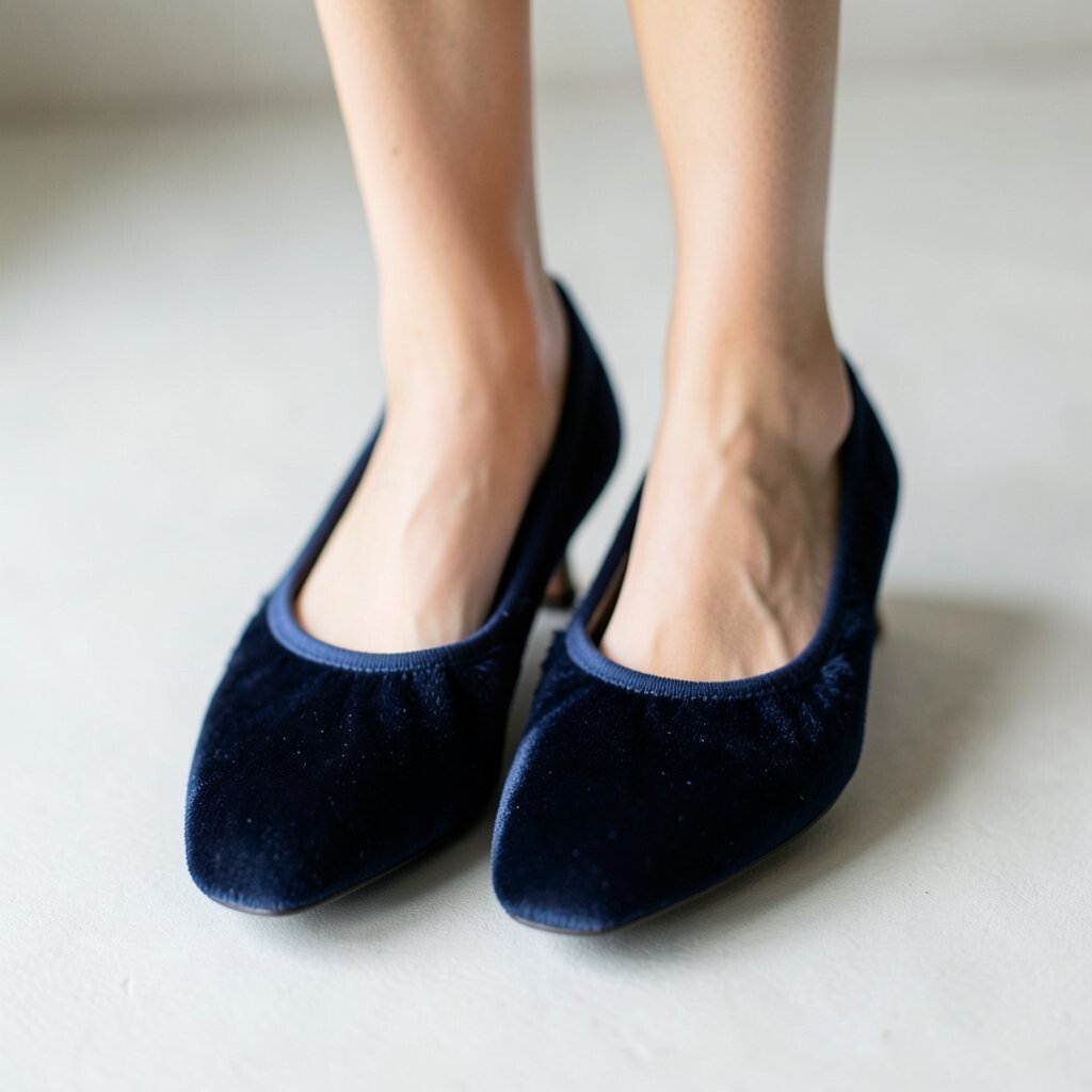 For a touch of luxury, navy blue velvet kitten heels are an exquisite choice. Their plush texture is both elegant and comfortable.