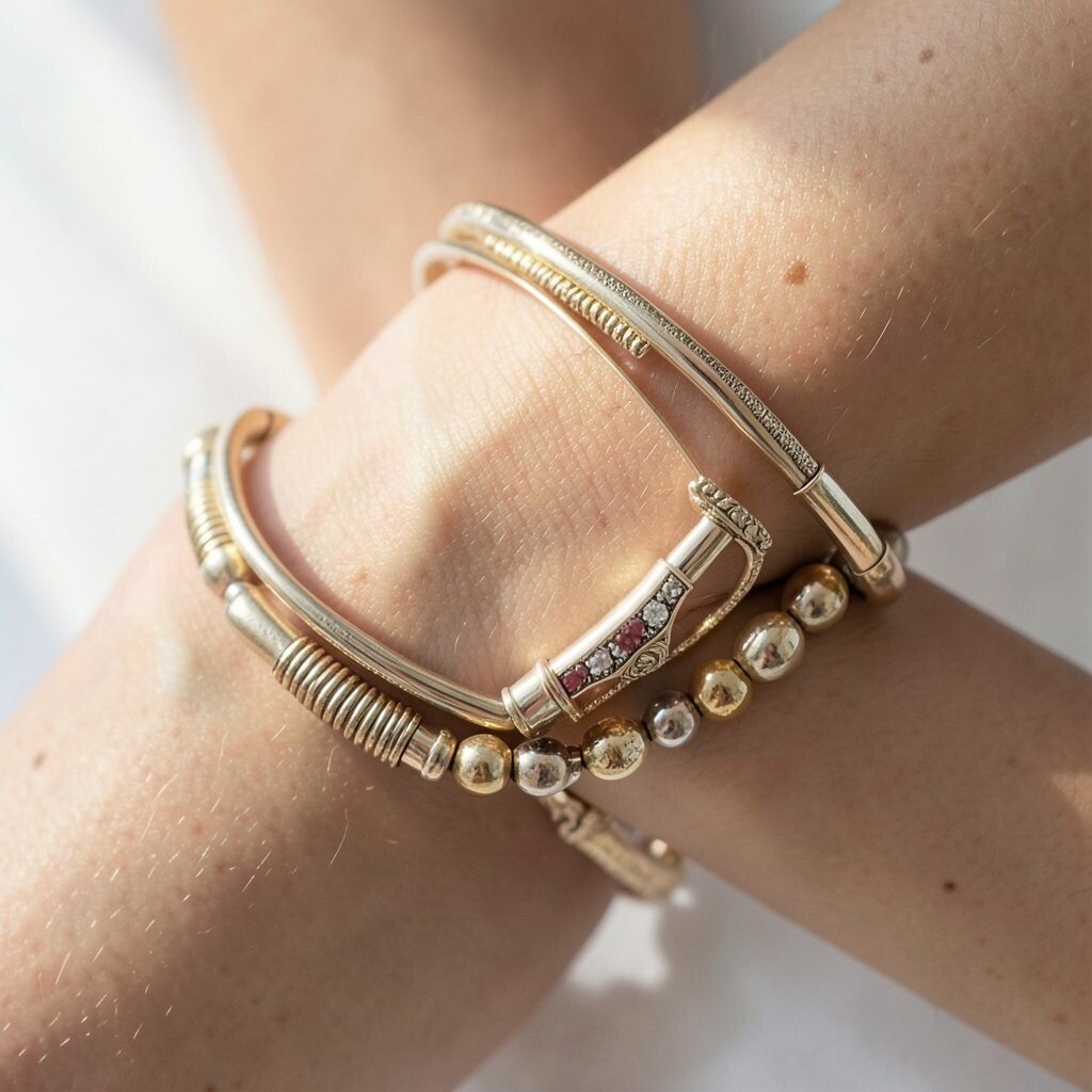 Stacking bracelets can add sparkle and personality to your look. Mix metals, beads, and textures for a fun combination.
