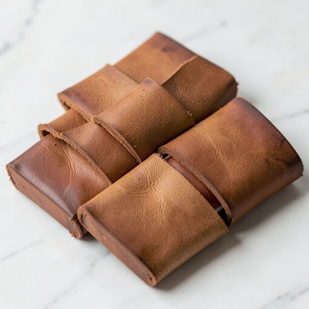 Stitched leather coaster sets can look elegant and handmade at the same time. The visible thread adds color and gives each square a finished edge.