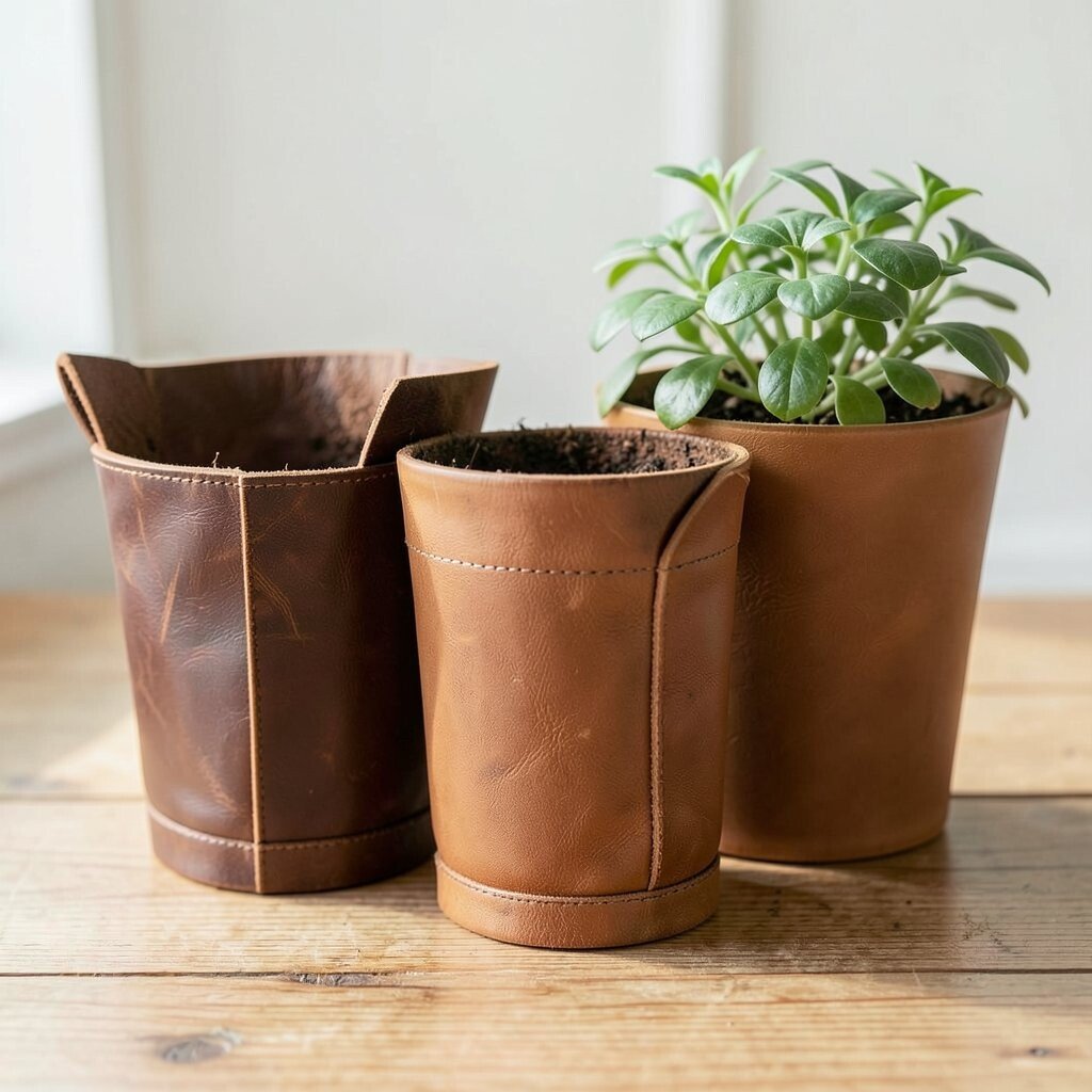 Leather plant pot sleeves give indoor pots a polished, modern look. The smooth surface and earthy color work well with green leaves and simple decor.