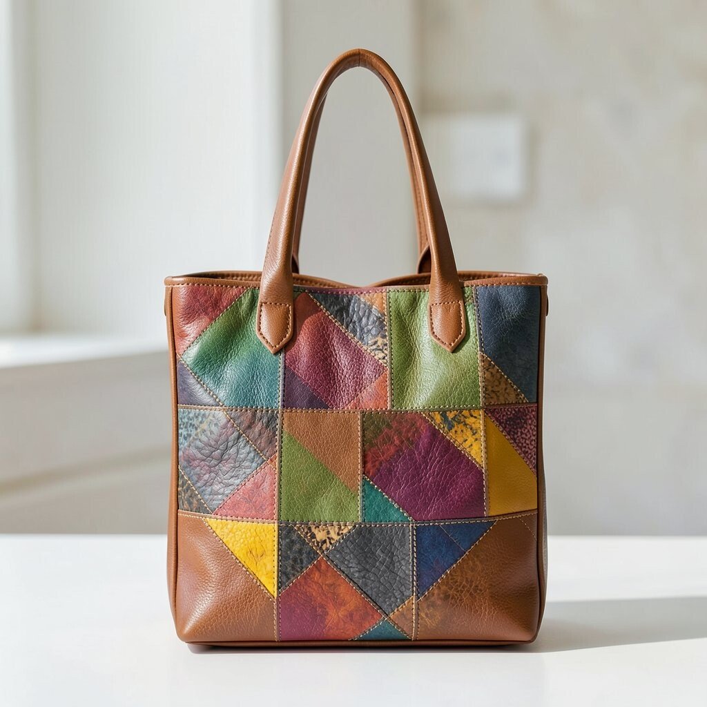 Stand out with a colorful patchwork leather tote that features various leather shades and textures. This bold choice is perfect for those who love vibrant fashion statements.