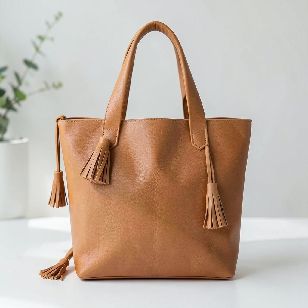 A tan leather tote with tassels adds a boho-chic vibe to your everyday look. The warm color tones blend beautifully with casual and formal attire.