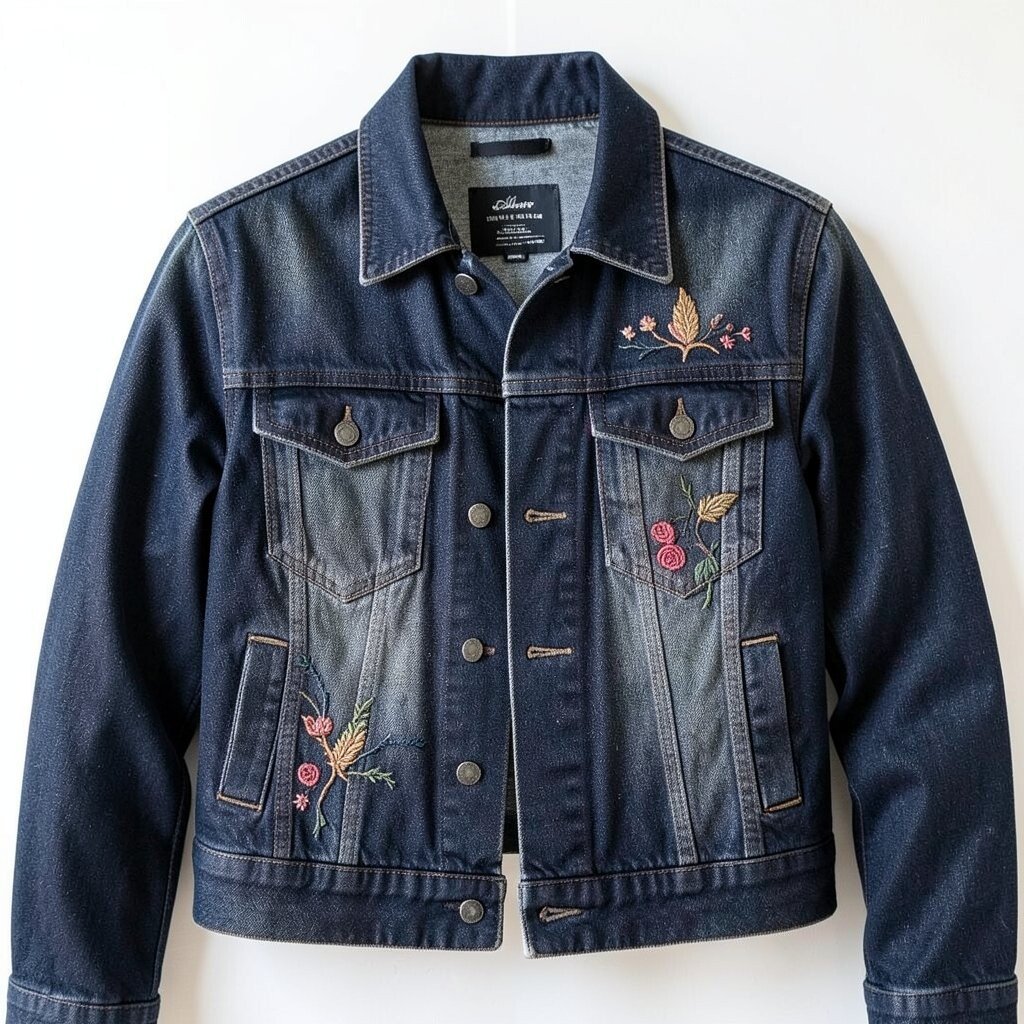A dark denim jacket with embroidery adds a touch of artistry to your outfit. The contrast of dark fabric and colorful threads creates a unique piece. It’s perfect for standing out in a crowd.