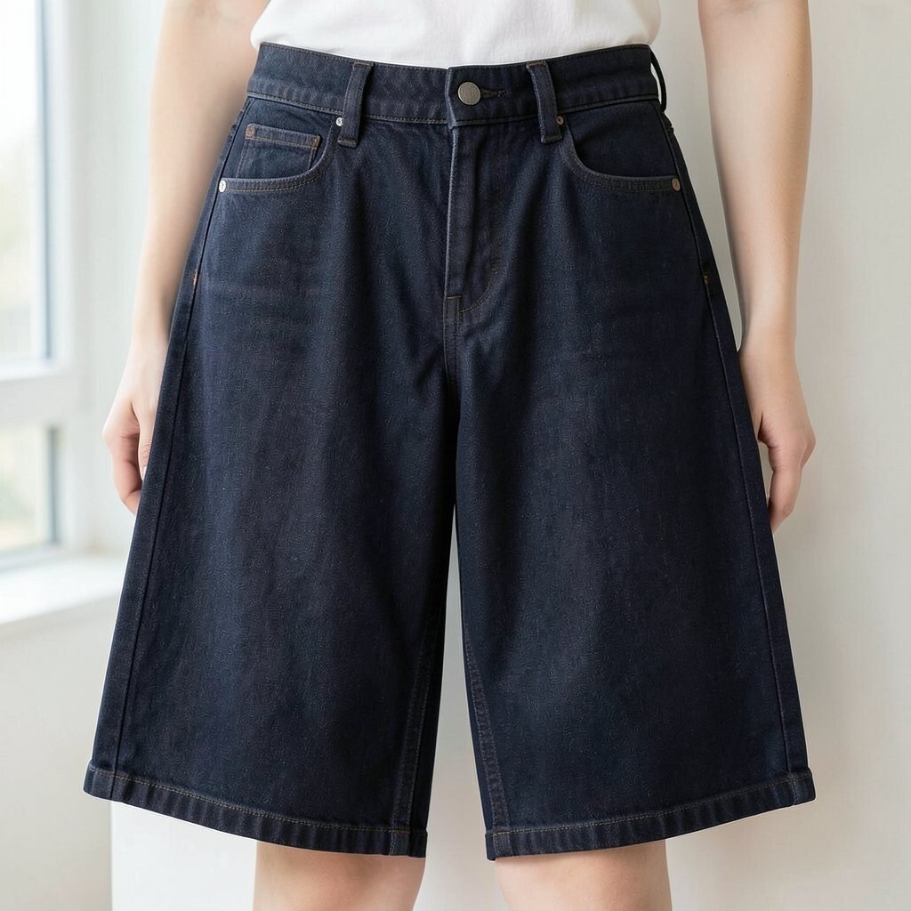 Dark denim shorts are great for a chic summer look. They pair well with bright tops or simple tees. The darker color is sophisticated yet casual.