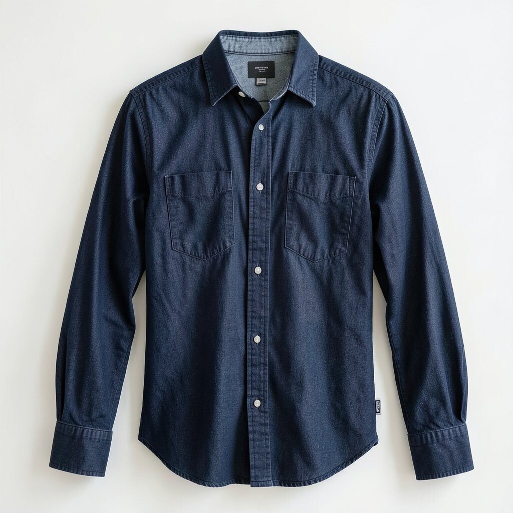 A dark denim button-up shirt is a versatile and stylish choice. Wear it open over a tee or buttoned for a polished look. The deep color adds a touch of classic cool.