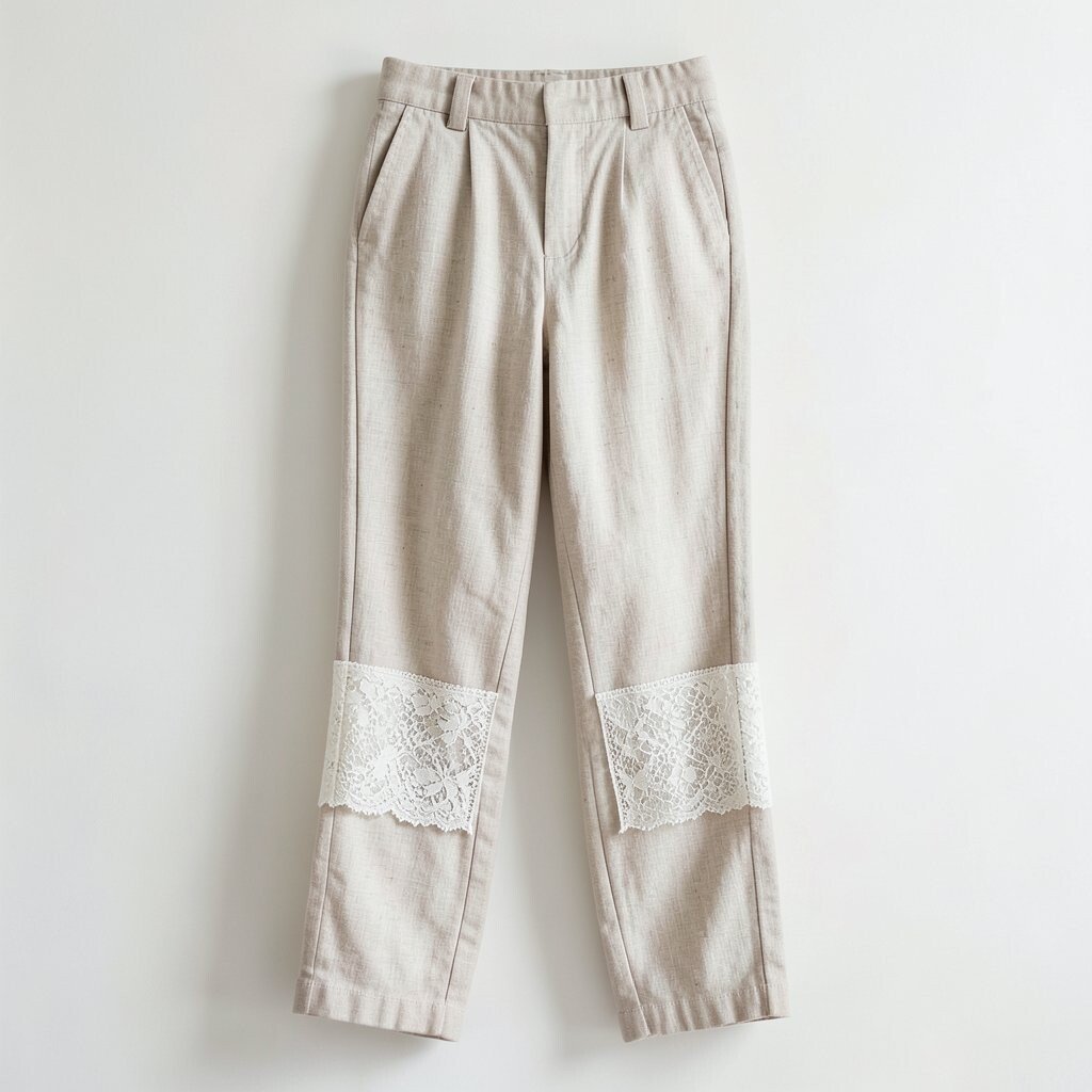 Linen pants with lace accents add a feminine touch. The delicate lace details elevate the simple fabric.