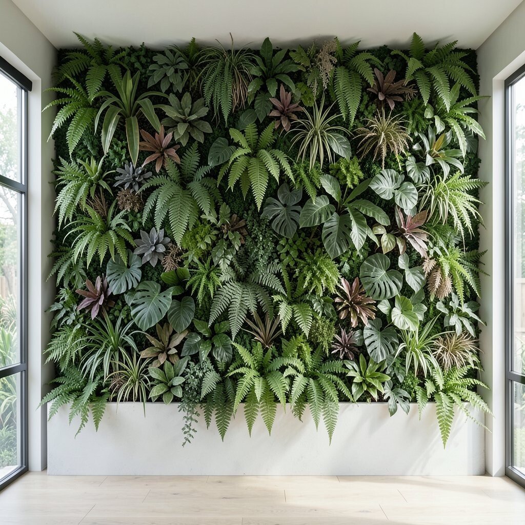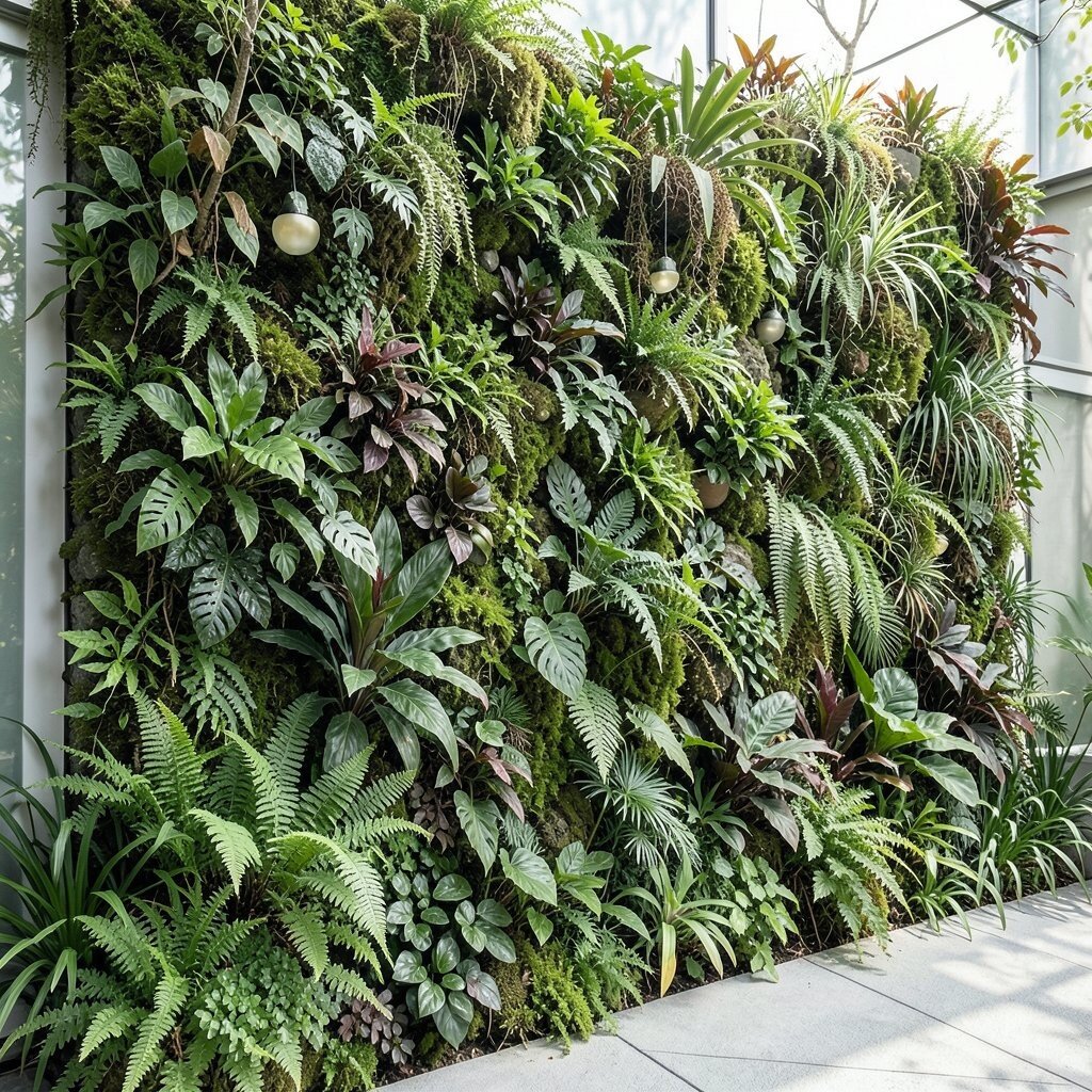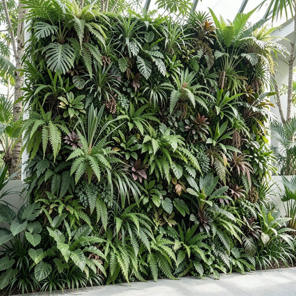 Create a lush paradise with a tropical vertical garden. Use plants like ferns, philodendrons, and bromeliads for a jungle effect.